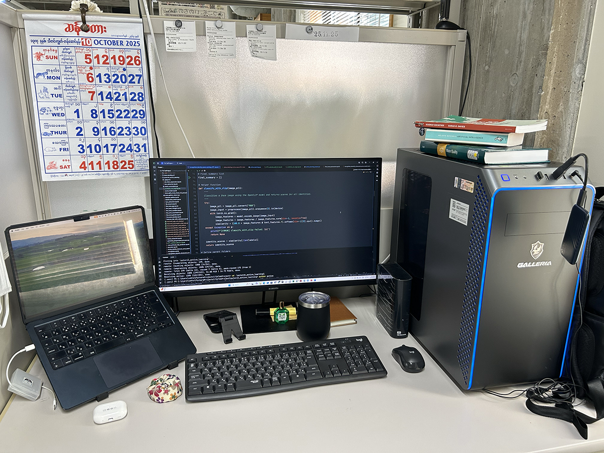 Now, at my current desk in CSEAS, the tools have not changed drastically, but they have grown alongside my research and experience. My must-haves today include a powerful desktop for deep learning and image processing, an external hard drive for storing large datasets, and a laptop for meetings and mobile writing. I also keep medical eye drops for eyestrain and a small Japanese Otedama for light exercise and thinking breaks. A few books on technical and regional studies are always within reach, reminding me that technology should serve to better understand people and places.